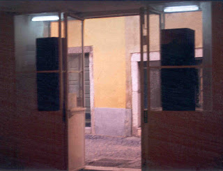 Dois blocos de azul ultramarino (I.K.B.) suspendem-se numa antiga montra que desenha a entrada. Algo entre um pórtico de acesso ou uma coluna de som regista a estranheza de quem passa.